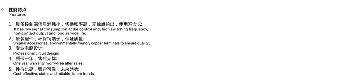 具備控制端信號消耗小,切換頻率高 無觸電輸出,使用壽命長 原裝配件,環保銅端子,保證質量 專業電路設計 質保一年,售后無憂 性價比高,穩定高,未來趨勢