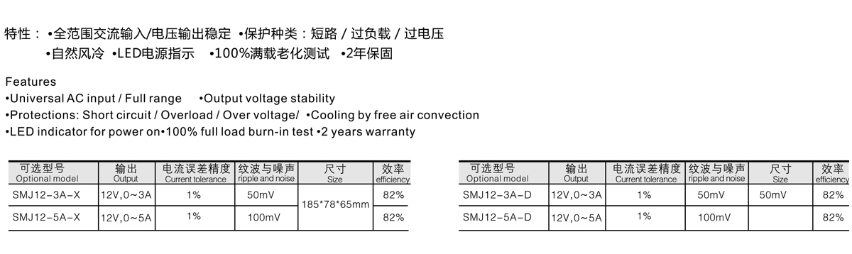 全范圍交流輸入/電壓輸出穩(wěn)定 有短路、過載、過熱保護 自然風冷散熱 LED電源指示 100%滿負荷燒機測試